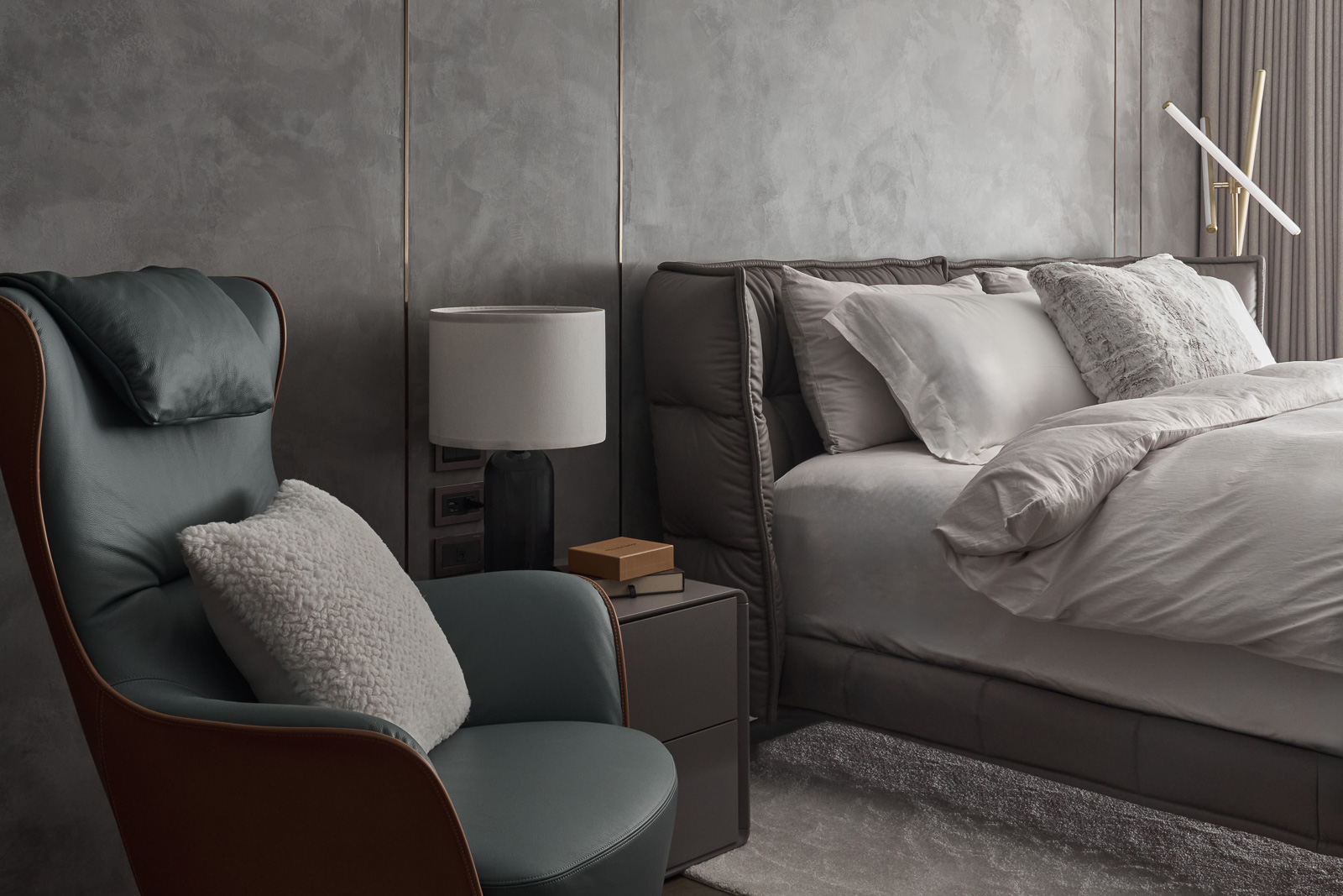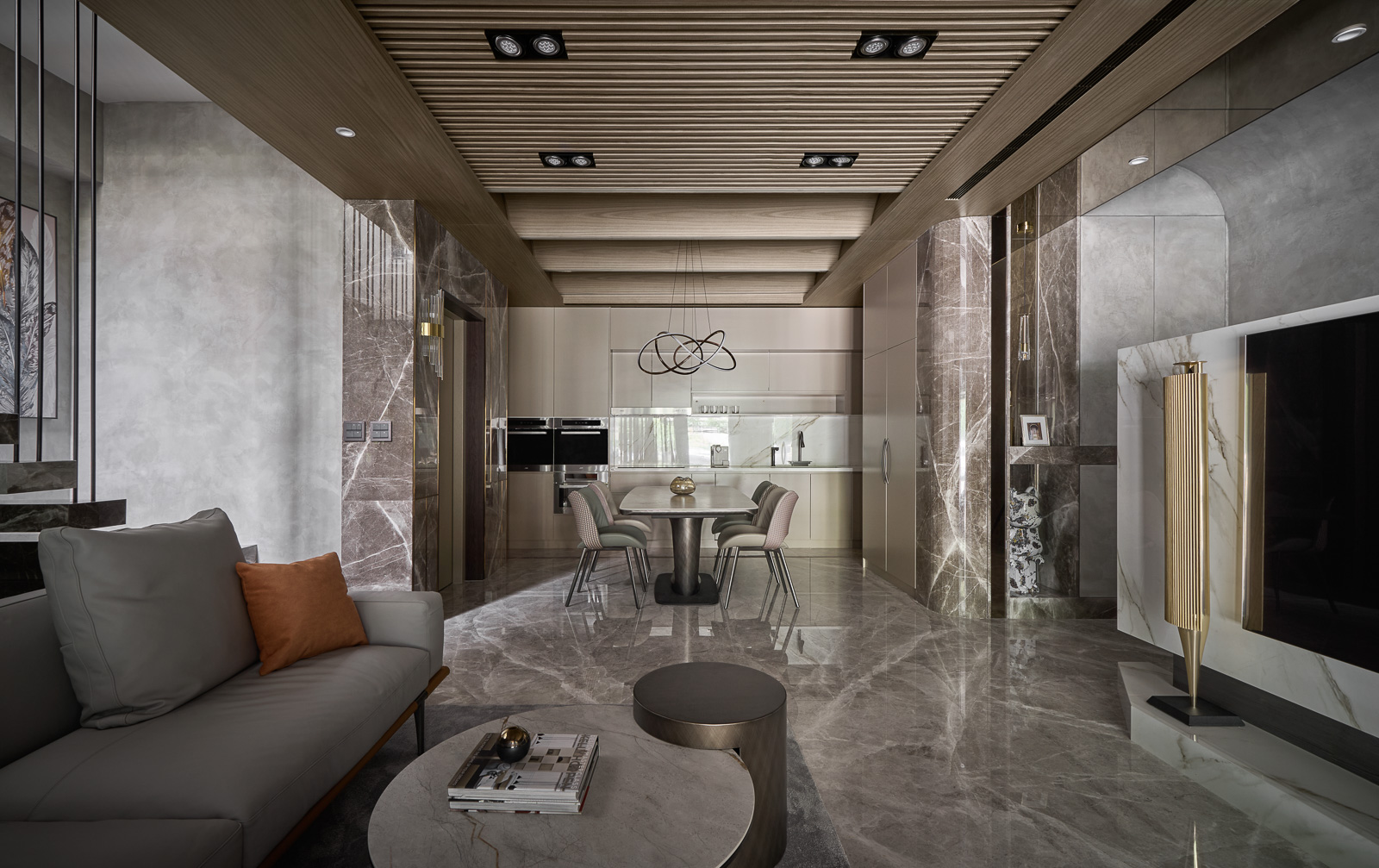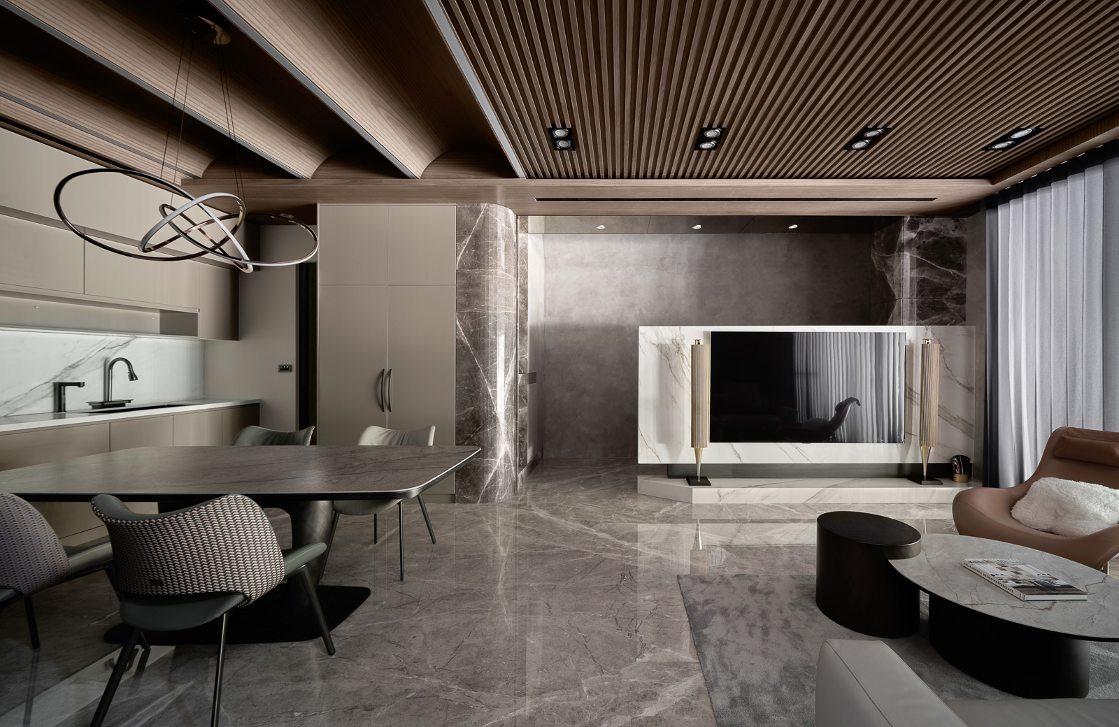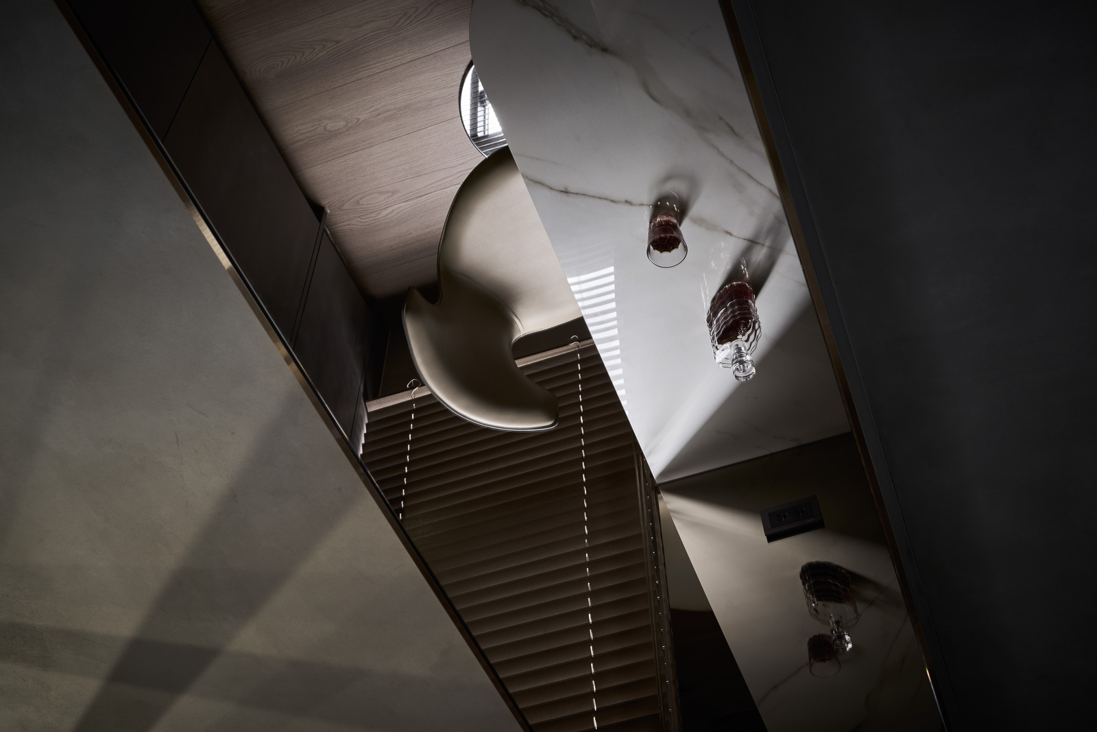 圓弧造型的天花板搭配開放式餐廚設計,讓整個空間看起來更流暢、有設計感。不只是視覺上的一致,也讓家人之間的互動更自然輕鬆,邊煮飯邊聊天,生活的節奏就在這樣的氛圍中慢慢展開。搭配義大利手工家具 Poltrona Frau,讓每一次用餐、停留,都是一種享受,待在家裡也像在度假。