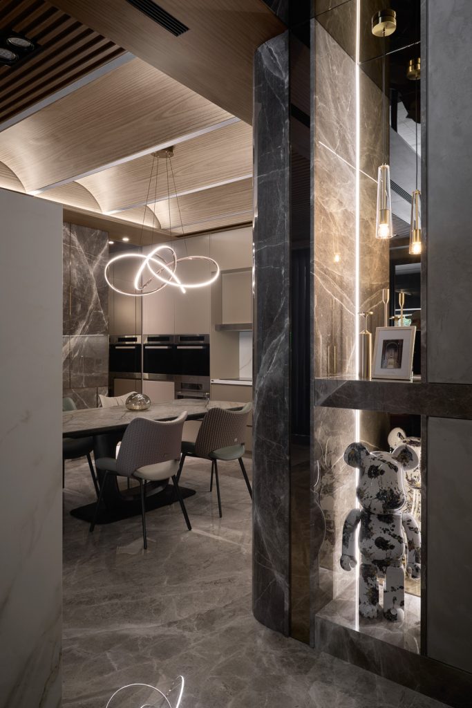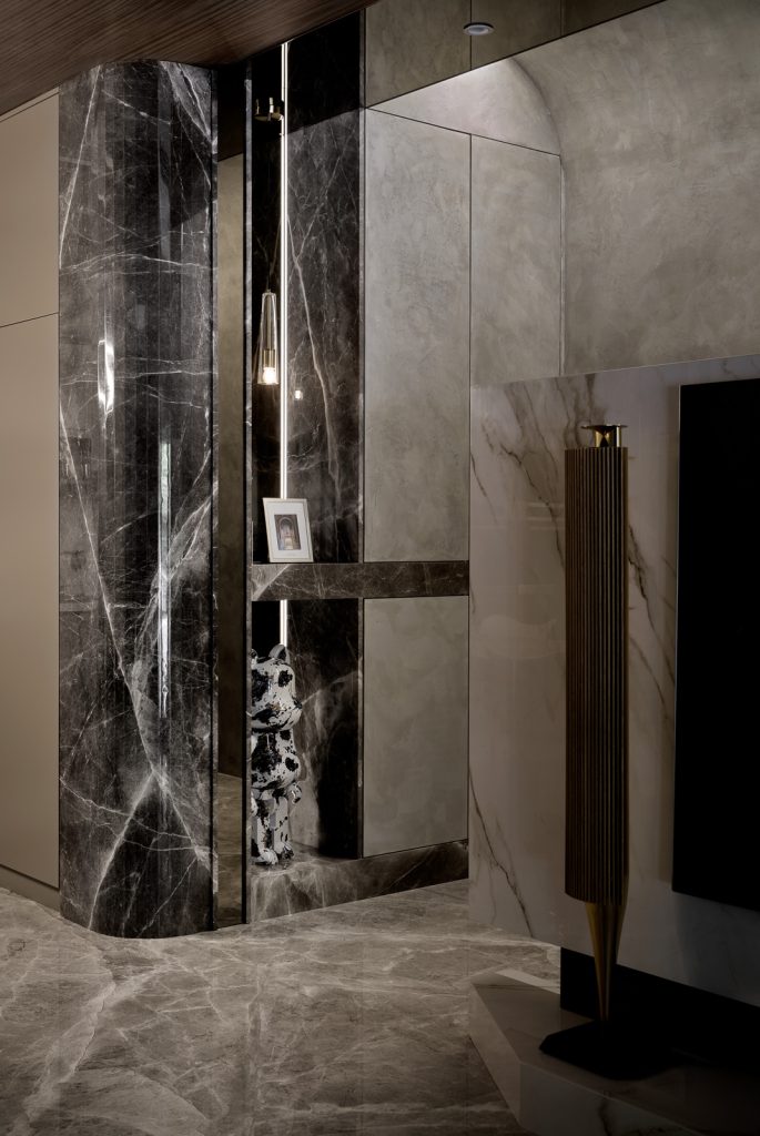 進門那一刻,就會被挑高的玄關吸引住——寬敞的高度讓空間立刻顯得大器有氣勢,但同時又保有溫潤不拘的氛圍,讓人放鬆。牆面特別選用了質感細膩的藝術塗料,搭配大理石材質的底座與細節收邊,光線灑進來時,材質間的層次感更顯低調奢華。整個空間像在悄悄說著:「歡迎回家」,既是視覺的第一印象,也是每天回家最療癒的片刻。